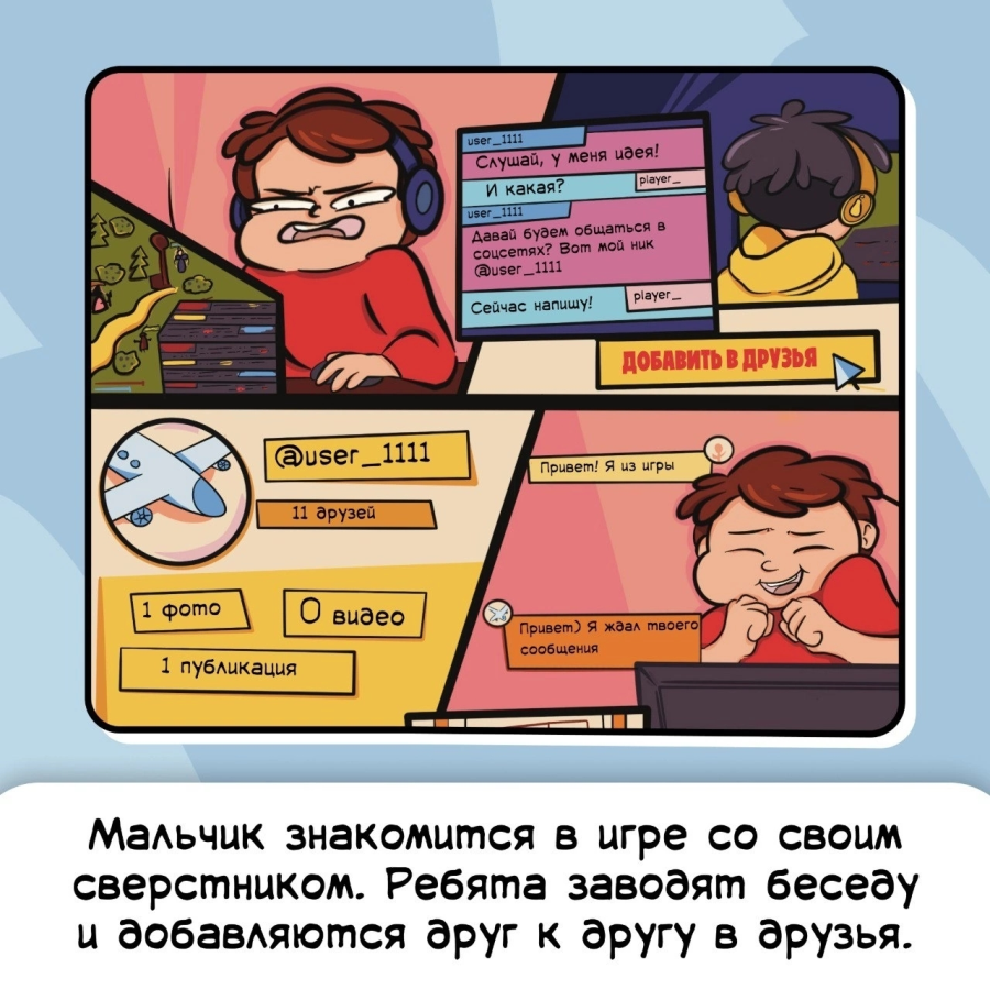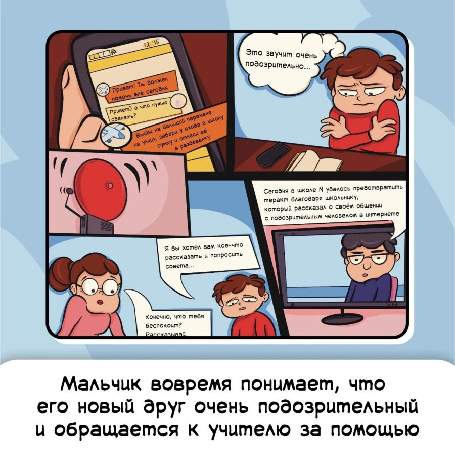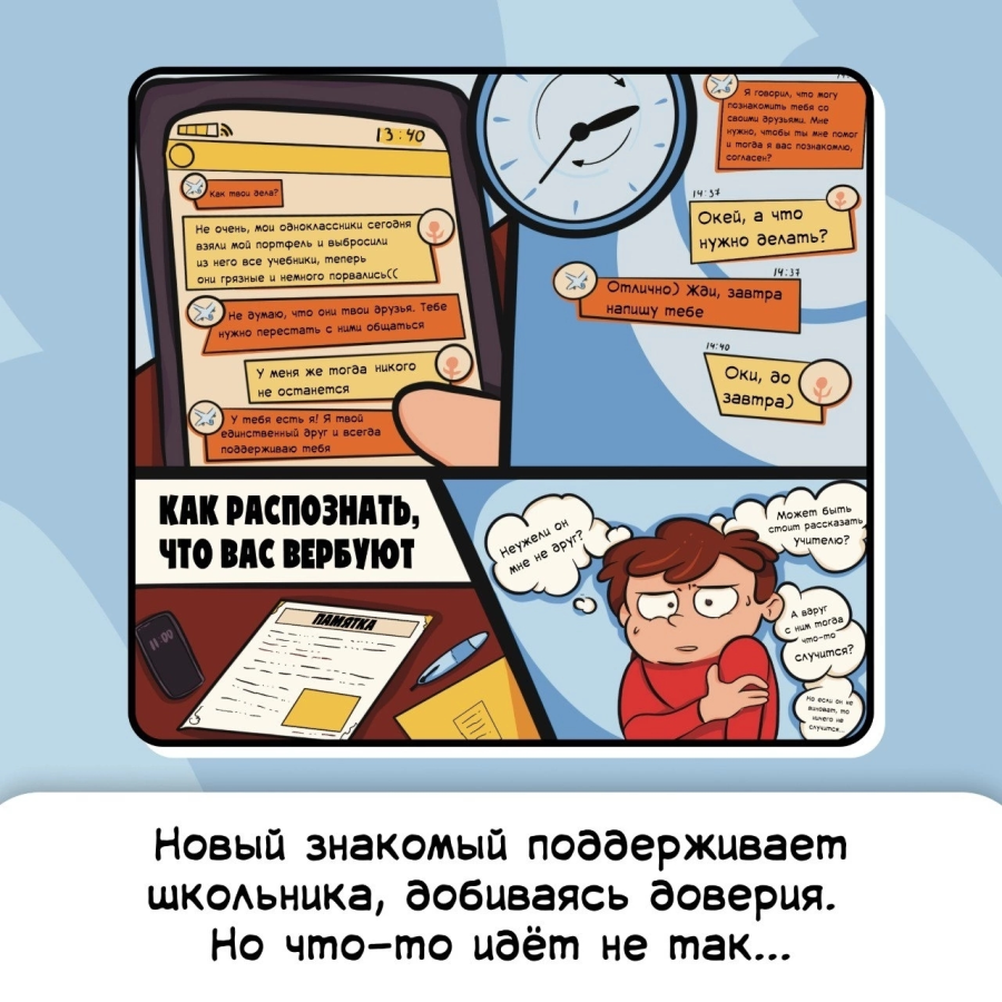 Комикс — это популярный жанр среди детей и подростков. Специалисты НЦПТИ по профилактике разработали сюжет, основанный на реальных кейсах вербовки школьников в противоправную деятельность.