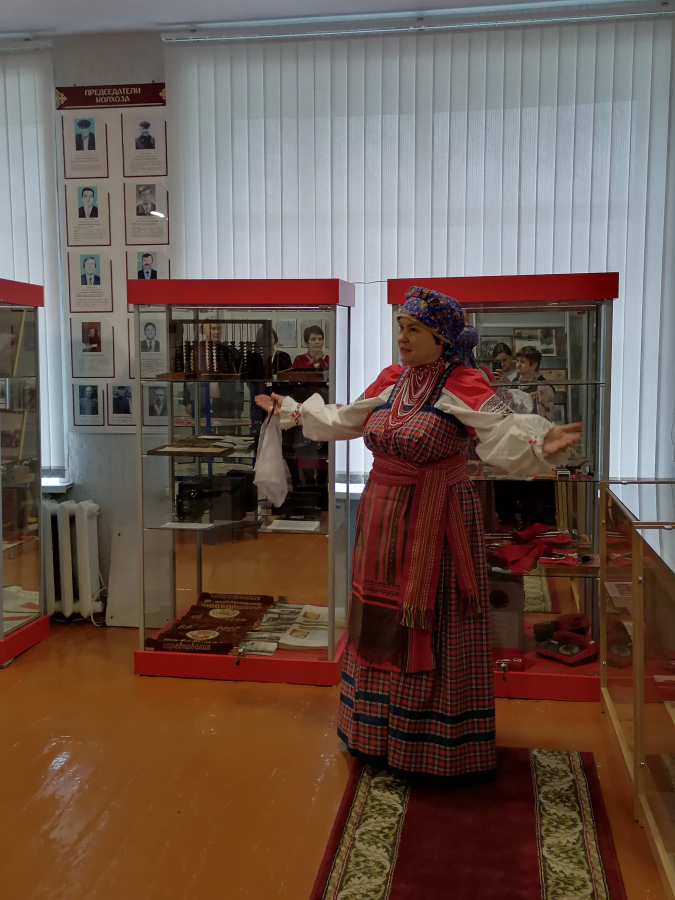 В рамках мероприятия для гостей руководитель школьного музея Сиркина Н.Н. провела экскурсию по залам, рассказывая об уникальных предметах и традициях прошлых времен. Гостям мероприятия посчастливилось увидеть различные народные предметы быта, утварь, костюмы. Каждый экспонат рассказывал свою историю, передавая атмосферу прошлого и позволяя ощутить связь с предками.